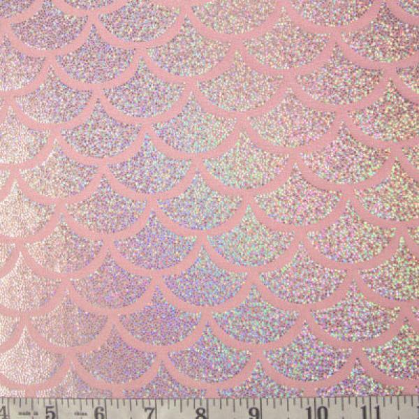 This is a Medium-Weight Mermaid Holographic Foil on Nylon Spandex Fabric, With a 2 Way Stretch, Silver/Light Pink Colored