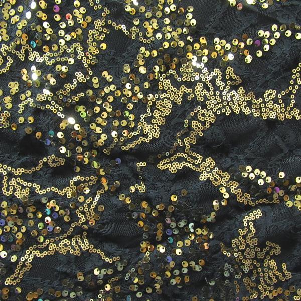 This is a Sequins on Lace, 4 Way Stretch, Gold/Black