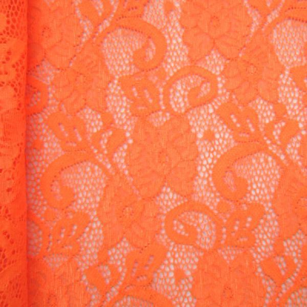 This is a Light-Weight Fancy Floral Lace on Nylon Spandex Fabric, With a 2 Way Stretch, Neon Orange Colored