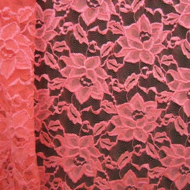 This is a Light-Weight Fancy Floral Lace on Nylon Spandex Fabric, With a 4 Way Stretch, Coral Colored