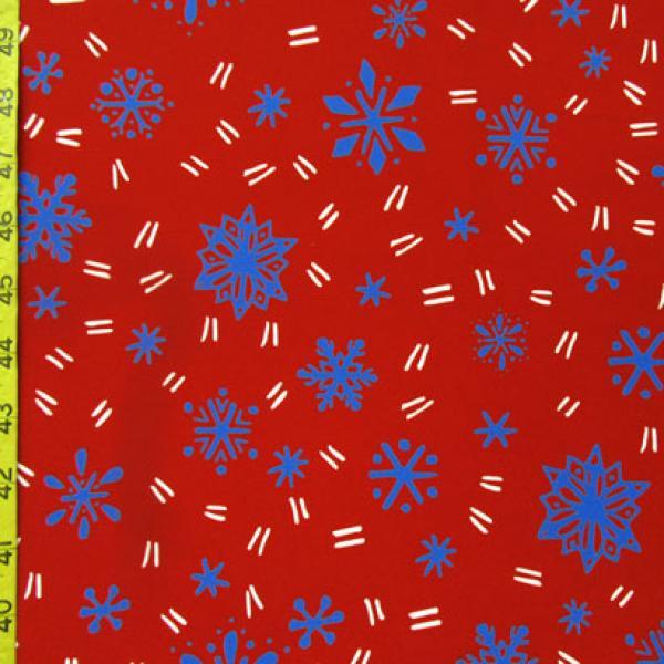 This is a Light-Weight Snowflake Print on Polyester Spandex Fabric, With a 4 Way Stretch, Royal/Red Colored