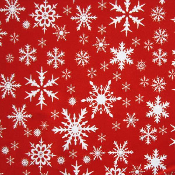This is a Light-Weight Snowflake Print on Polyester Spandex Fabric, With a 4 Way Stretch, White/Crimson Colored