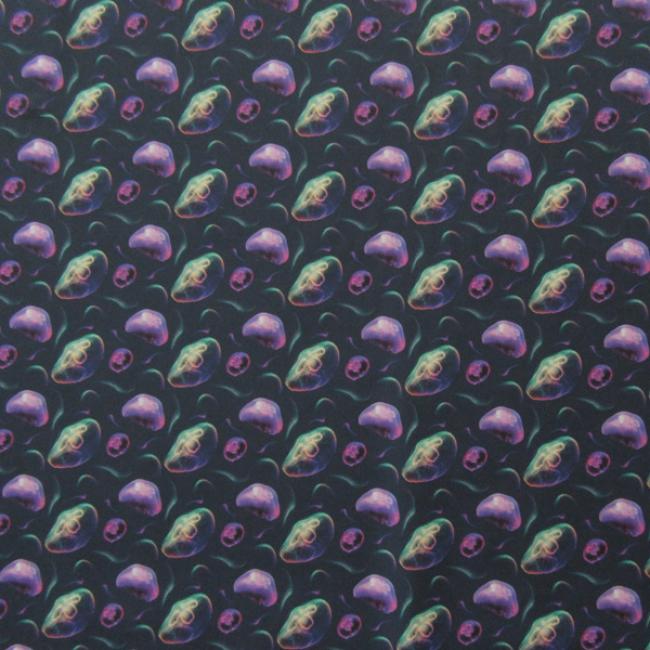 This is a Light-Weight 3D Leaf Bubbles Printed Spandex Fabric, With a 4 Way Stretch, Multi Color/Dark Blue Colored