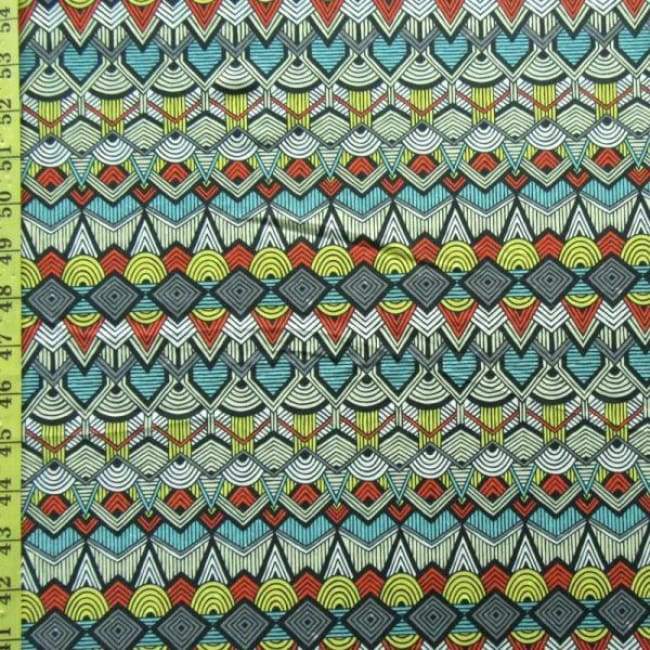 This is a Light-Weight Aztec Print on Polyester Spandex Fabric, With a 4 Way Stretch, Multi-Colored Colored
