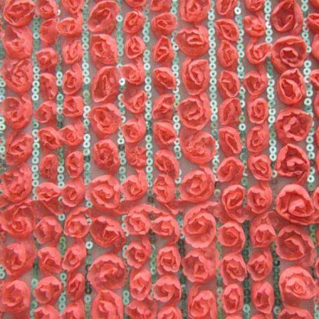 This is a Medium-Weight Embroidery & Sequins on Stretch Mesh Fabric, With a 2 Way Stretch, Coral Colored