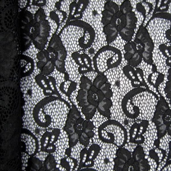 This is a Light-Weight Fancy Floral Lace on Nylon Spandex Fabric, With a 2 Way Stretch, Black Colored