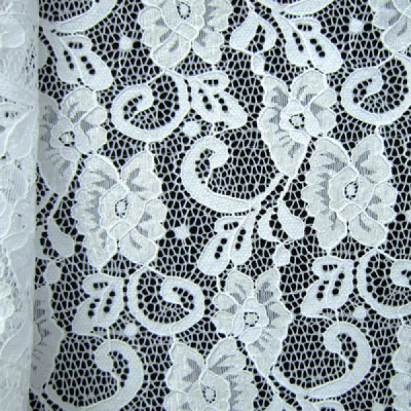 This is a Light-Weight Fancy Floral Lace on Nylon Spandex Fabric, With a 2 Way Stretch, White Colored