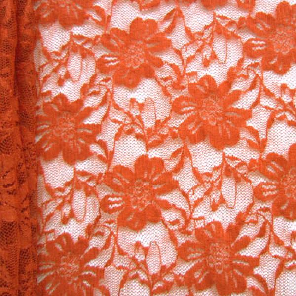 This is a Light-Weight Fancy Floral Lace on Nylon Spandex Fabric, With a 4 Way Stretch, Neon orange Colored