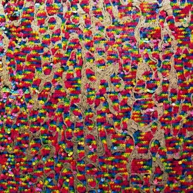 This is a Medium-Weight Fancy Leopard Print Sequins on Polyester Spandex Fabric, With a 2 Way Stretch, Multi-Colored Colored