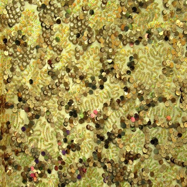 This is a Medium-Weight Fancy Shiny Holographic Sequins on Stretch Mesh Fabric, With a 2 Way Stretch, Gold/Natural Colored