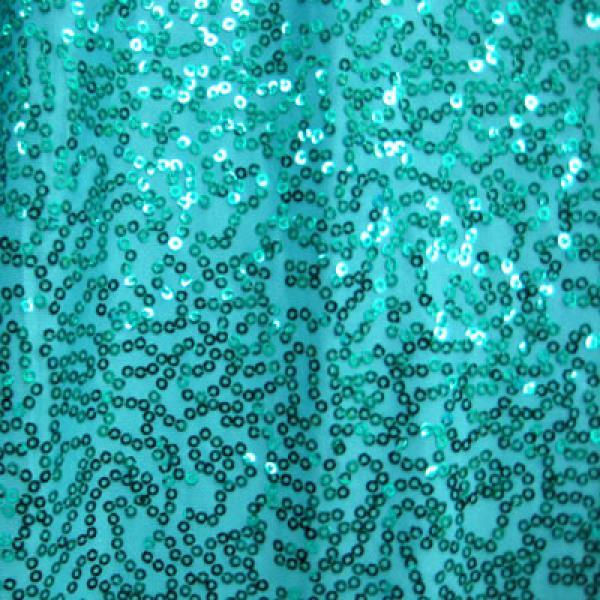 This is a Medium-Weight Fancy Squiggle 2mm Sequins on Polyester Spandex Fabric, With a 2 Way Stretch, Aqua Colored