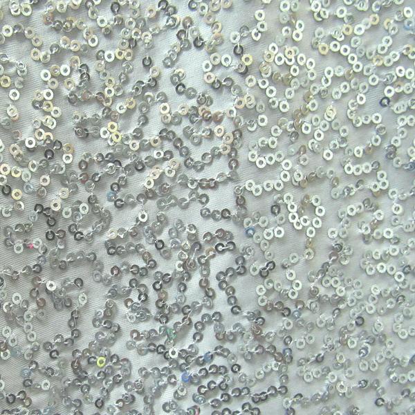 This is a Medium-Weight Fancy Squiggle 2mm Sequins on Polyester Spandex Fabric, With a 2 Way Stretch, Silver/White Colored