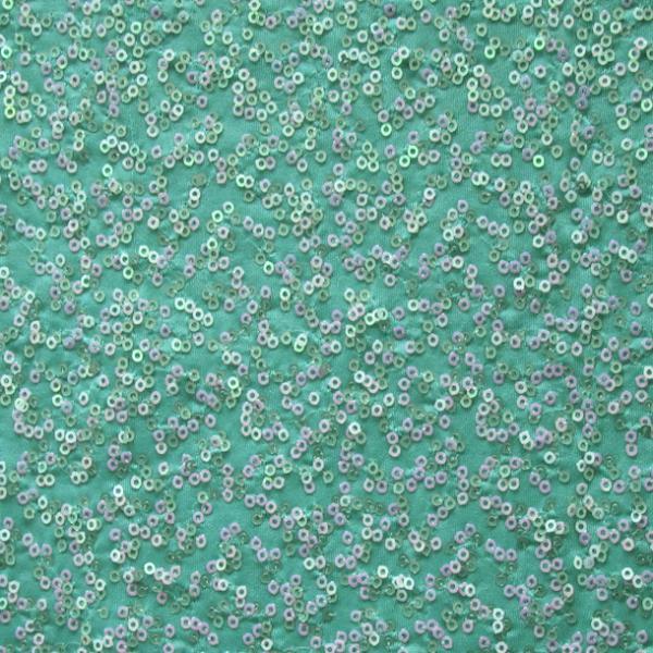 This is a Medium-Weight Fancy Squiggle 2mm Sequins on Polyester Spandex Fabric, With a 2 Way Stretch, Teal/Iridescent Colored
