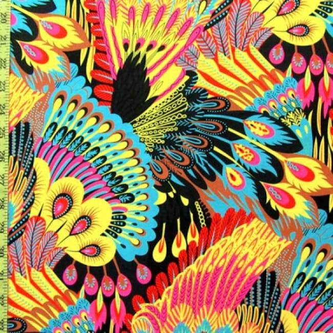 This is a Light-Weight Feather Helmet Print on Polyester Spandex Fabric, With a 4 Way Stretch, Multi-Colored Colored