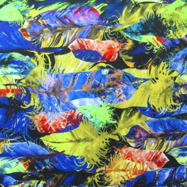 This is a Light-Weight Feather Print on Polyester Spandex Fabric, With a 4 Way Stretch, Multi-Colored Colored