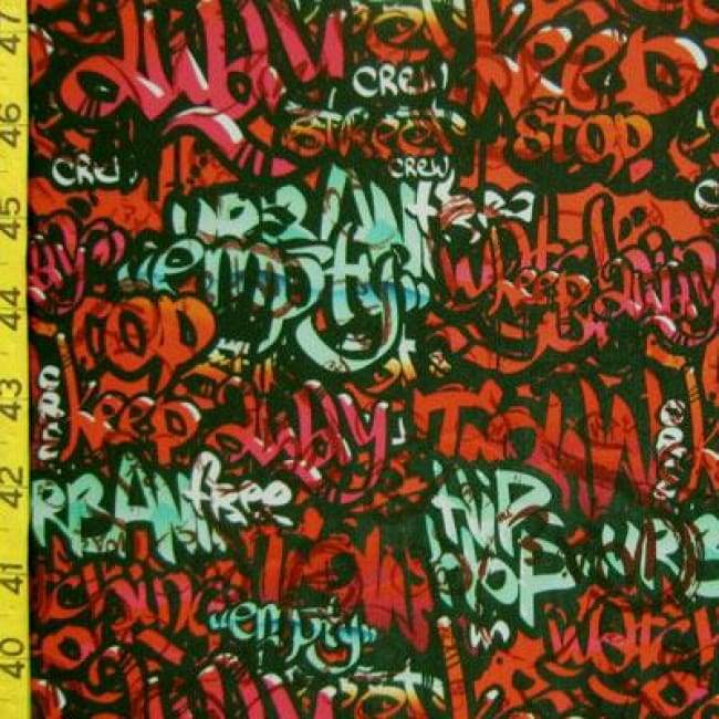 This is a Light-Weight Graffiti Print on Nylon Spandex Fabric, With a 4 Way Stretch, Multi-Colored Colored