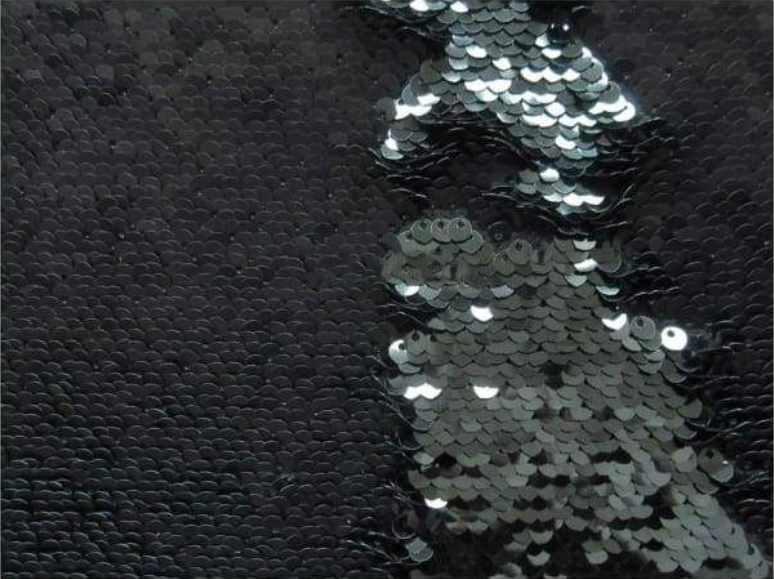 This is a Medium-Weight Heavy Reversible Sequins on Polyester Spandex Fabric, With a 2 Way Stretch, Black Colored