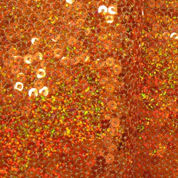 This is a Medium-Weight Holographic 5mm Sequins on Stretch Mesh Fabric, With a 2 Way Stretch, Orange Colored