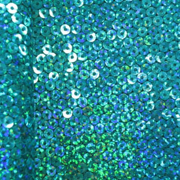 This is a Medium-Weight Holographic 5mm Sequins on Stretch Mesh Fabric, With a 2 Way Stretch, Turquoise Colored