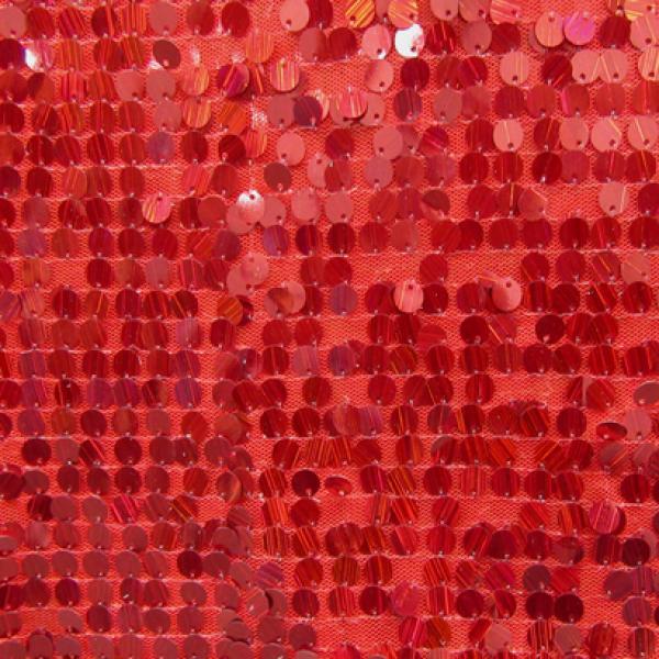 This is a Medium-Weight Holographic 6mm Sequins on Stretch Mesh Fabric, With a 2 Way Stretch, Red Colored