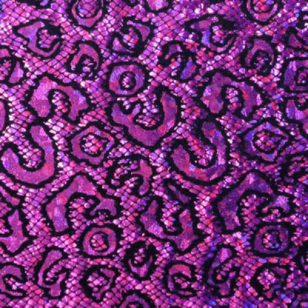 This is a Medium-Weight Holographic Animal Print & Scales Metallic Foil on Nylon Spandex Fabric, With a 4 Way Stretch, Purple/Black Colored
