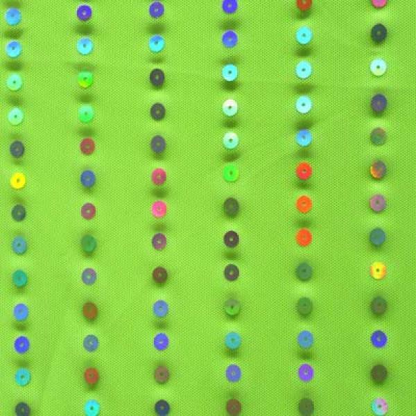 This is a Medium-Weight Holographic Sequins on Mesh on Stretch Mesh Fabric, With a 4 Way Stretch, Neon Yellow Colored