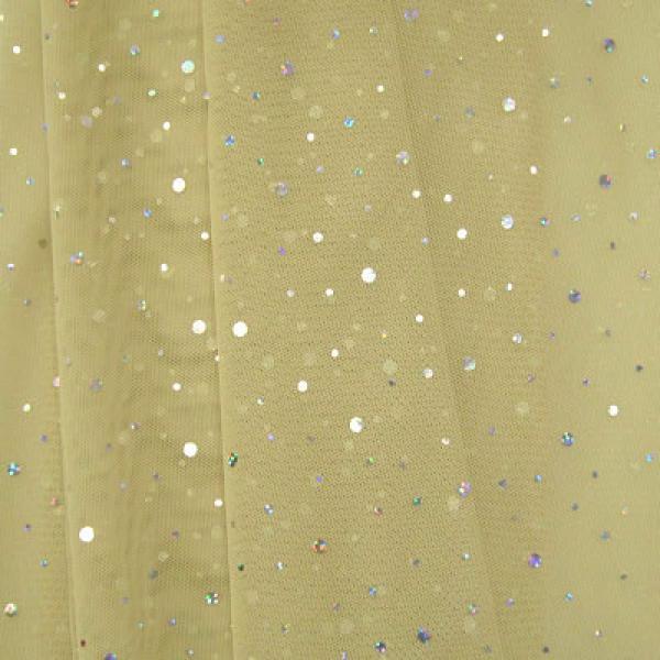 This is a Medium-Weight Holographic Sequins on Mesh on Stretch Mesh Fabric, With a 4 Way Stretch, Silver/Nude Colored
