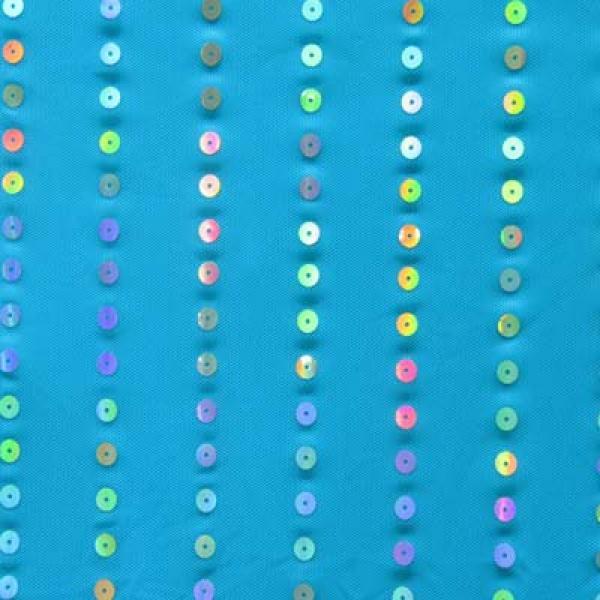 This is a Medium-Weight Holographic Sequins on Mesh on Stretch Mesh Fabric, With a 4 Way Stretch, Turquoise Colored