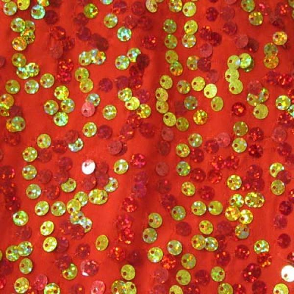 This is a Medium-Weight Holographic Sequins on Polyester Spandex Fabric, With a 2 Way Stretch, Red/Gold Colored