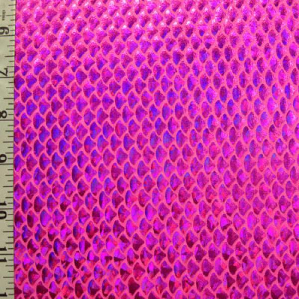 This is a Medium-Weight Holographic Small Mermaid Metallic Foil on Nylon Spandex Fabric, With a 4 Way Stretch, Fuchsia Colored