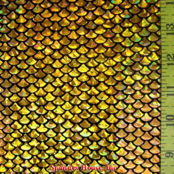 This is a Medium-Weight Holographic Small Mermaid Metallic Foil on Nylon Spandex Fabric, With a 4 Way Stretch, Gold/Black Colored