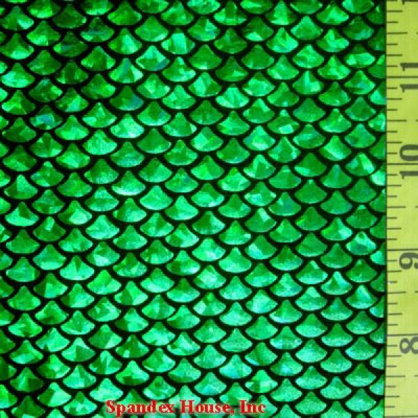 This is a Medium-Weight Holographic Small Mermaid Metallic Foil on Nylon Spandex Fabric, With a 4 Way Stretch, Kelly/Black Colored