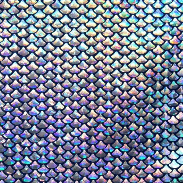 This is a Medium-Weight Holographic Small Mermaid Metallic Foil on Nylon Spandex Fabric, With a 4 Way Stretch, Silver/Navy Colored