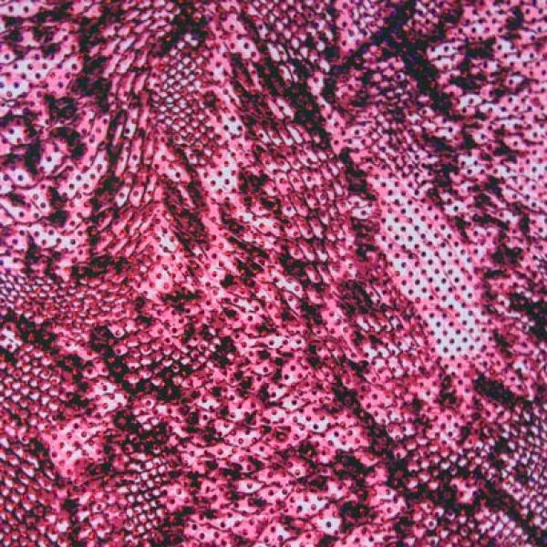 This is a Medium-Weight Holographic Snake Print Sequin on Polyester Spandex Fabric, With a 4 Way Stretch, Pink Colored