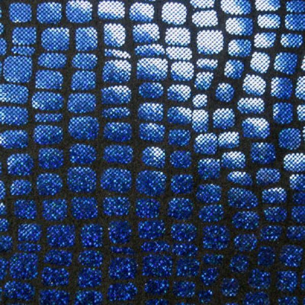This is a Medium-Weight Holographic Squares Print on Nylon Spandex Fabric, With a 4 Way Stretch, Royal/Black Colored