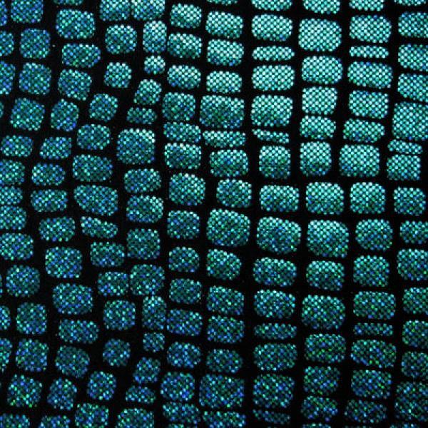 This is a Medium-Weight Holographic Squares Print on Nylon Spandex Fabric, With a 4 Way Stretch, Turquoise/Black Colored