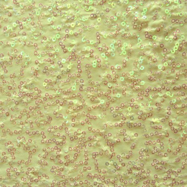 This is a Medium-Weight Holographic Squiggle 2mm Sequins on Polyester Spandex Fabric, With a 2 Way Stretch, Iridescent/Lemon Yellow Colored