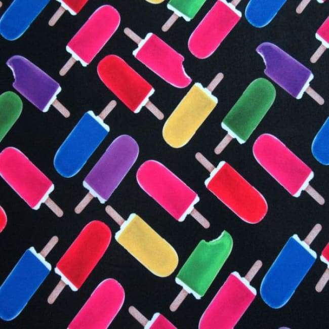 This is a Light-Weight Ice Cream Print on Polyester Spandex Fabric, With a 4 Way Stretch, Black/Cream Colored