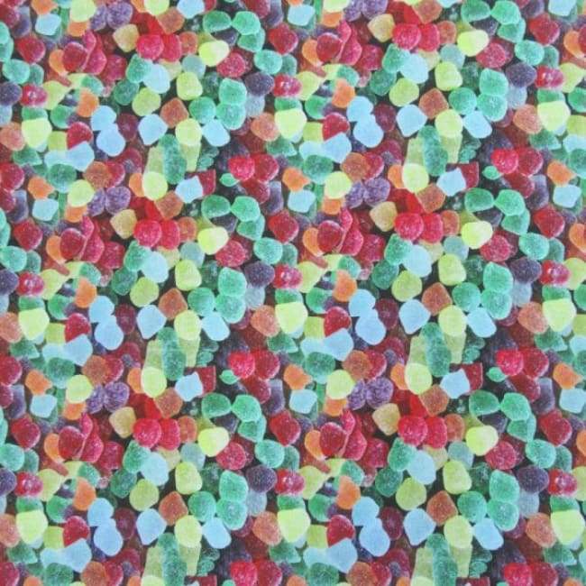 This is a Light-Weight Jelly Dots Candy Print on Polyester Spandex Fabric, With a 4 Way Stretch, Multi-Colored Colored
