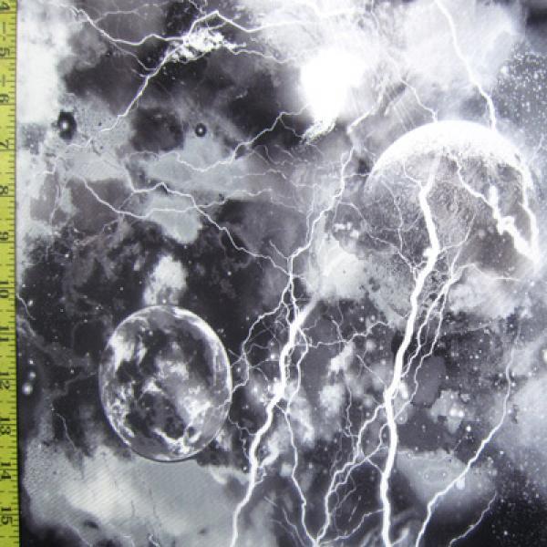 This is a Light-Weight Lightning Storm Print on Polyester Spandex Fabric, With a 4 Way Stretch, Multi-Colored Colored