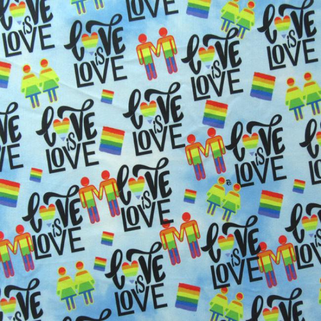 This is a Light-Weight Love is Love Printed Spandex Fabric, With a 4 Way Stretch, Sky Blue/Black Colored