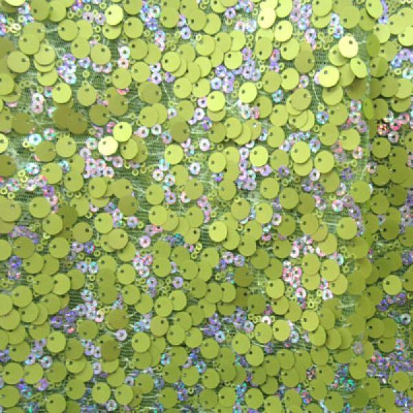 This is a Matte Holographic 2mm/5mm Sequins on Tulle on Tulle, Non-Stretch, Silver/Apple Green
