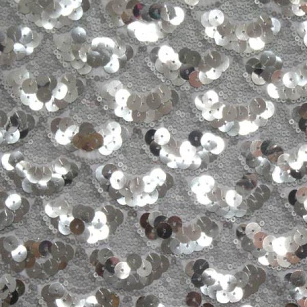 This is a Medium-Weight Matte Shiny Sequins on Polyester Spandex Fabric, With a 2 Way Stretch, Silver/White Colored