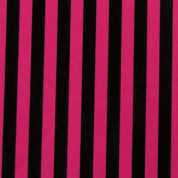 This is a Light-Weight Matte Vertical .5" Stripe Print on Polyester Spandex Fabric, With a 4 Way Stretch, Black/Fuchsia Colored