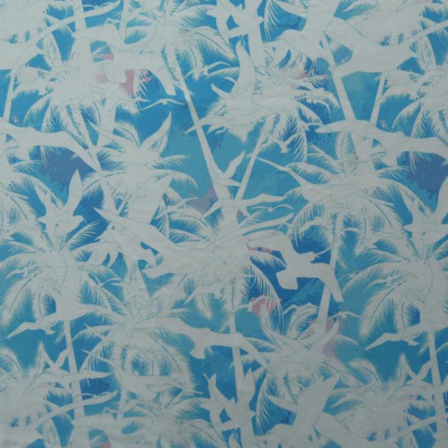 Leaf Negative Printed Spandex Fabric, 4 Way Stretch, White/Sky Blue