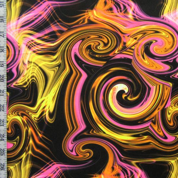 This is a Light-Weight Psychedelic Swirl Print on Polyester Spandex Fabric, With a 4 Way Stretch, Fuchsia/Yellow/Gold Colored
