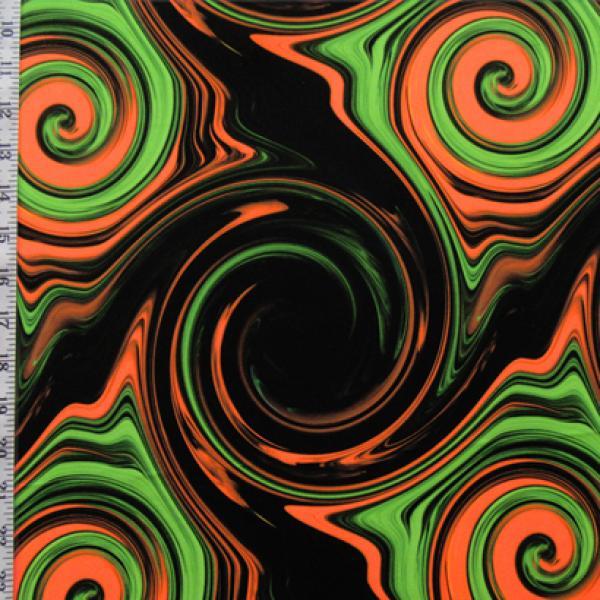 This is a Light-Weight Psychedelic Swirl Print on Polyester Spandex Fabric, With a 4 Way Stretch, Orange/Green/Black Colored