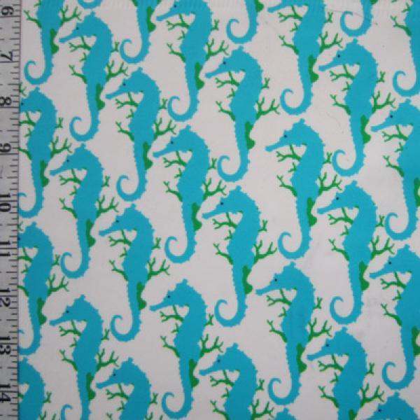 This is a Medium-Weight Seahorse Print on Nylon Spandex Fabric, With a 4 Way Stretch, White/Turquoise Colored