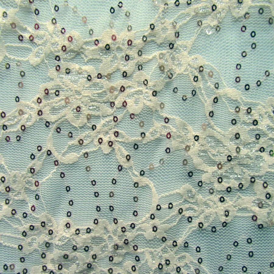 This is a Medium-Weight Sequin Lace On Mesh Fabric, With a Stretch, Ivory Colored