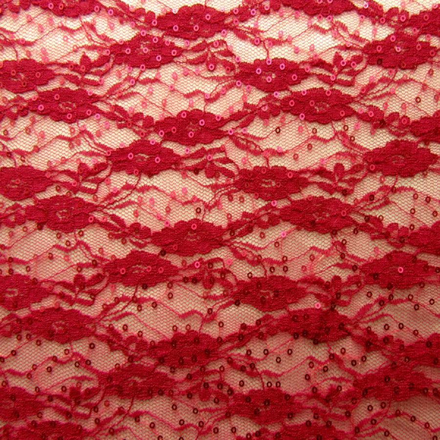 This is a Medium-Weight Sequin Lace On Mesh Fabric, With a Stretch, Red Colored